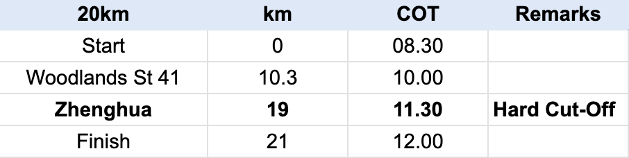 Venue: Pepys Road CarparkRoute: 20K ROUTEDate: 2026-06-07 (Sunday)Ages: 15+**Open for Public with additional category for Cross Country Students in Singapore πΈπ¬ (min age: 15)Time: Singapore – UTC +8Start: 2026-06-07 @ 08:30:00End: 2026-06-07 @ 13:30:00Final Cut-Off Time: 5 hrs